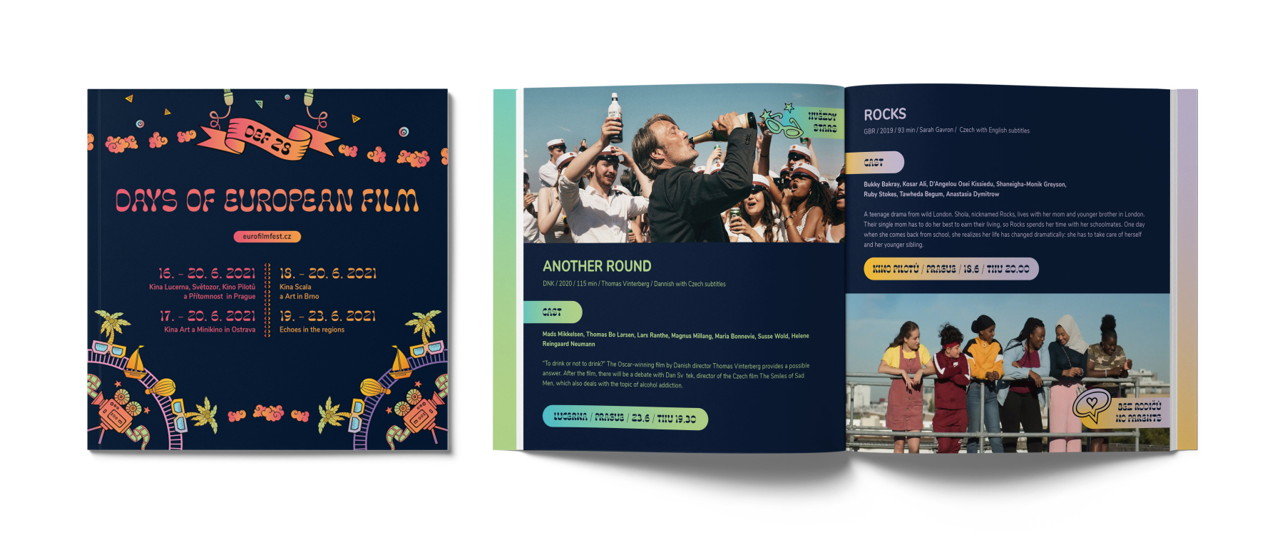 Days of European Film is a festival based in Prague. The visual identity changes every year, including creative concept, logo, colors, and typography, but cinema and film are always the main themes. In particular, the 2021 edition figures the movie and imagination universe through a mandala. I created the visuals during pandemic hard times. Practicing meditation helped a lot. I compared the moment of watching a movie to a sacred spiritual journey.